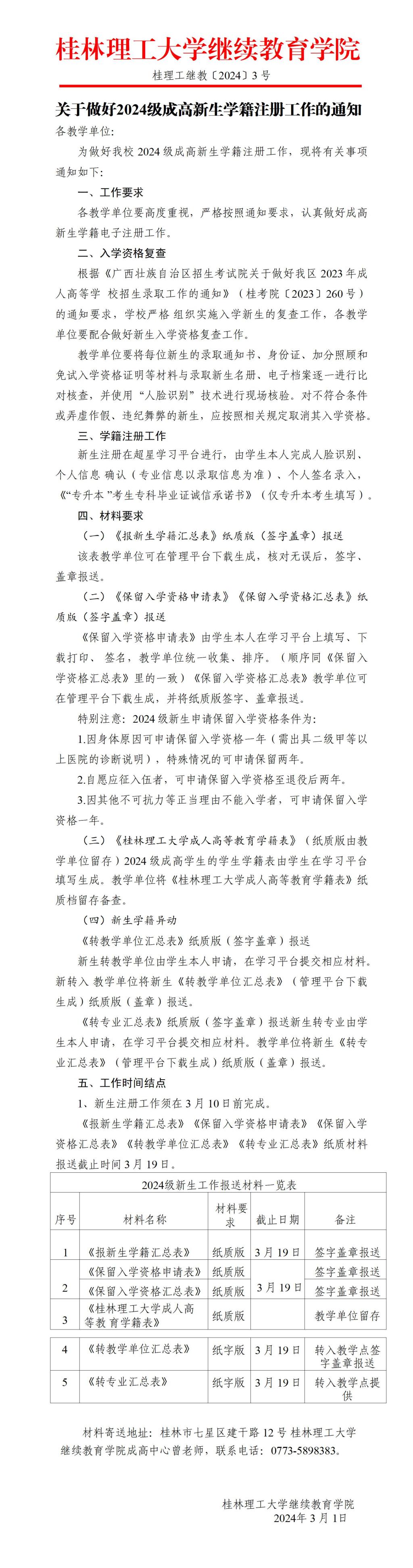 关于做好2024级成高新生学籍注册工作的通知 发布者:成高管理中心 2024-03-01 已阅人次 (一审:曾婕 二审:段伟才 三审:李衡) 上一条:关于对滕茂星等成人高等教育2024级新生按放弃入学资格处理的公示 下一条:9499www威尼斯2024年新增高等学历继续教育校外教学点遴选结果的公示 关注我们